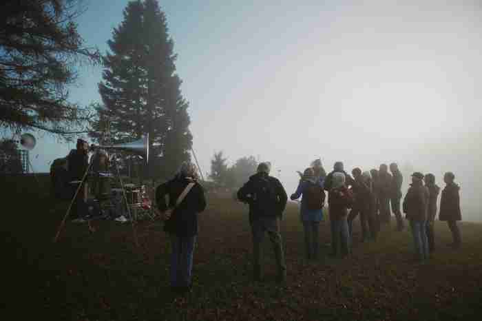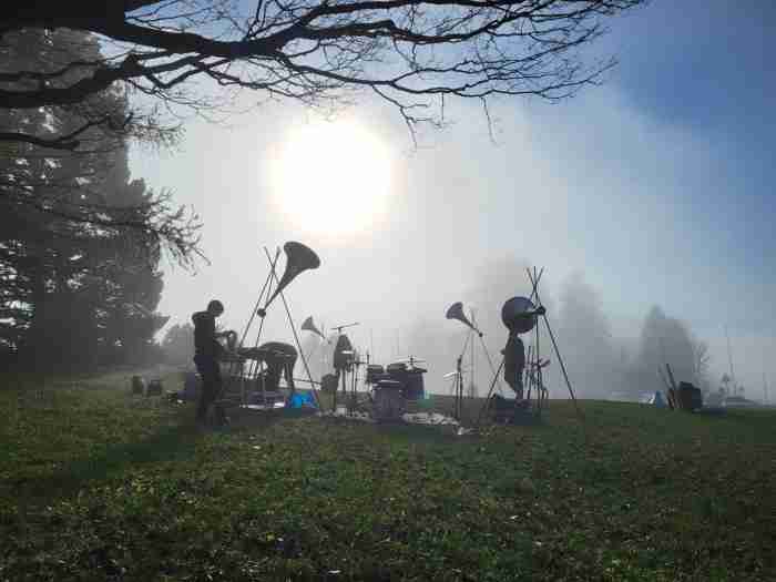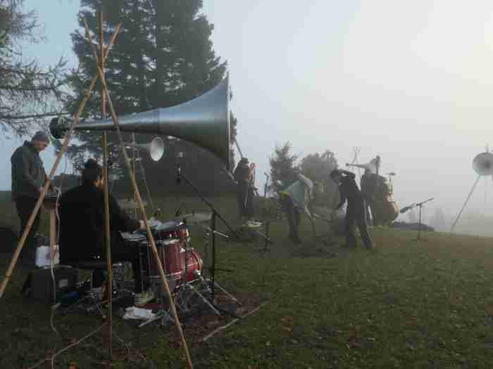 The Chuchchepati Orchestra installs itself, for example, in the garden of the Swiss National Sound Archives in Lugano. The four musicians are ready to play. Two gardeners enter the scene and bring a tree and tools. The orchestra begins to play – the tree is planted. Each instrument is amplified by a loudspeaker. The sounds support the gardeners in their hard physical work. Each hornspeaker of the Chuchchepati Orchestra is microphoned and digitally recorded.