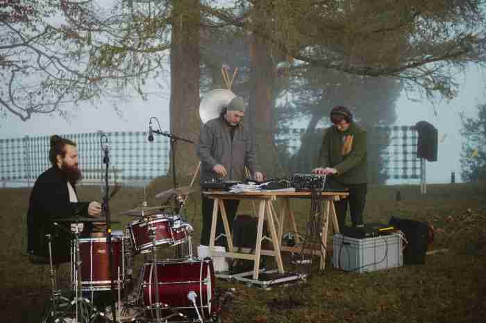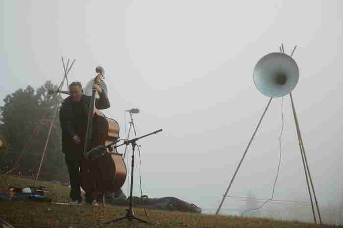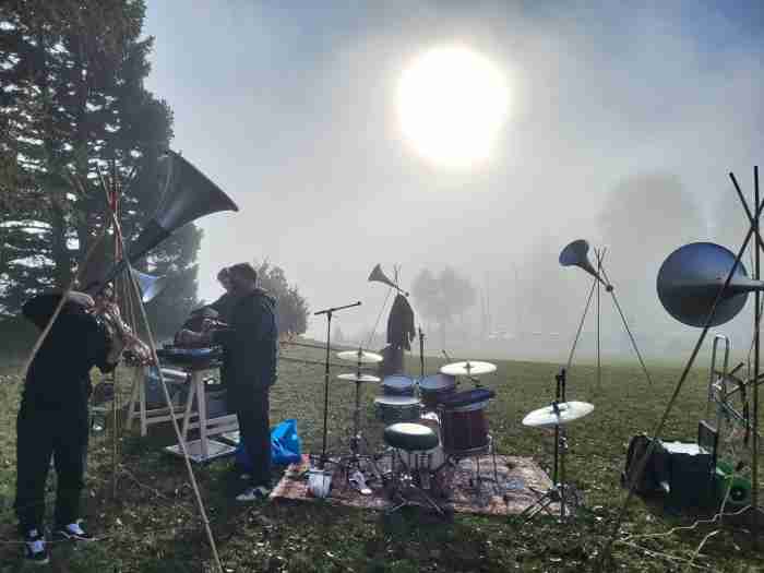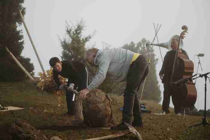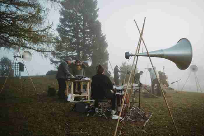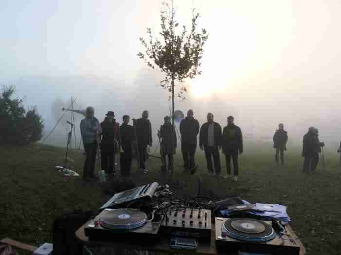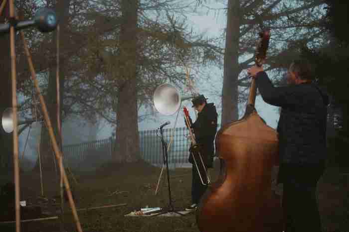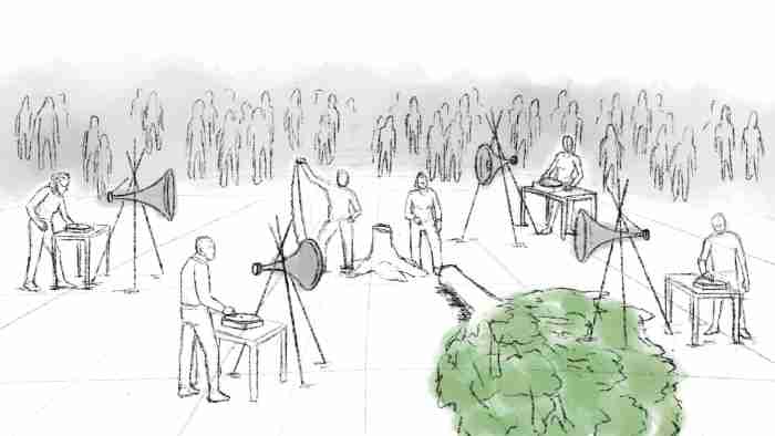 The Chuchchepati Orchestra installs itself, for example, in the garden of the Swiss National Sound Archives in Lugano. The four musicians are ready to play. Two gardeners enter the scene and bring a tree and tools. The orchestra begins to play – the tree is planted. Each instrument is amplified by a loudspeaker. The sounds support the gardeners in their hard physical work. Each hornspeaker of the Chuchchepati Orchestra is microphoned and digitally recorded.